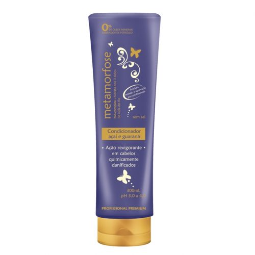 O Condicionador Açaí e guaraná foi desenvolvido para surpreender por suas propriedades revigorantes e regeneradoras, agindo potencialmente em cabelos danificados, devolvendo o brilho, sedosidade e maciez perdidos através de processos químicos. Condicionador altamente nutritivo rico em óleos vegetais. Após lavar os cabelos com Shampoo açaí e guaraná Metamorfose, aplique o condicionador massageando os fios como se estivesse penteando-os com os dedos. Deixe agir por alguns minutos e enxágue retirando bem o excesso. Após, aplique o Defrisante açaí e guaraná, se necessário. 300 ML.