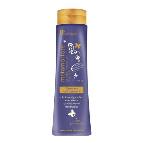 Shampoo de ação suave, pH equilibrado e sem sal. Aplique o Shampoo açaí e guaraná Metamorfose nos cabelos molhados, massageando o couro cabeludo e espalhando o produto suavemente nos fios. Enxágue e repita o processo. Após, aplique o Condicionador açaí e guaraná Metamorfose. 300 ML.